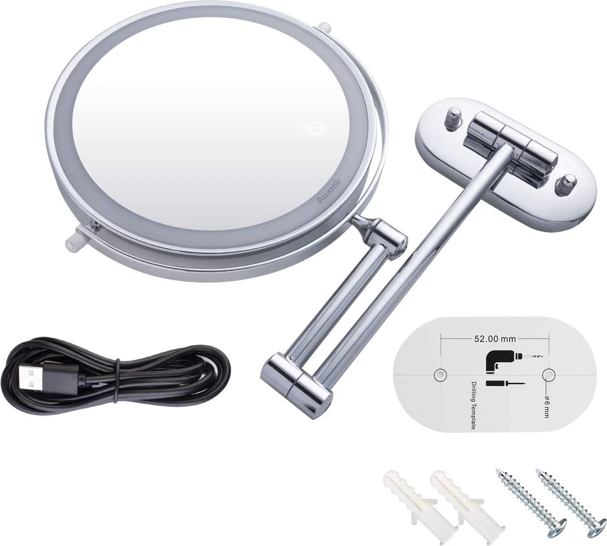 Auxmir Cosmetische Spiegel Met 1X / 10X Vergroting LED Verlichting, Dimbare Make-up Spiegel Met Touch Schakelaar USB Oplaadbare, Scheerspiegel 360 ° Draaibare Muurbeugel Voor Badkamer, Spa En Hotel