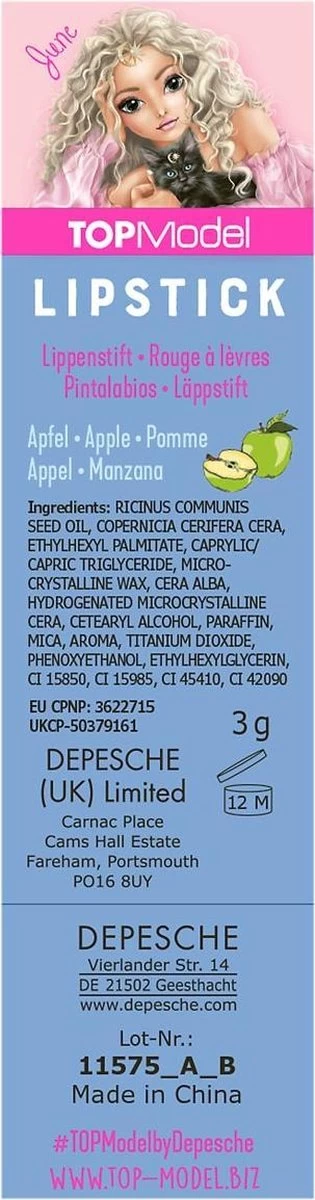 Kitty in pink! De TOPModel lippenstift “Moonlight” heeft schattige kattenoren op de dop. Paars ruikt naar milkshake, roze naar appel. De lippenstiften zijn licht dekkend. Inhoud: 3 g.