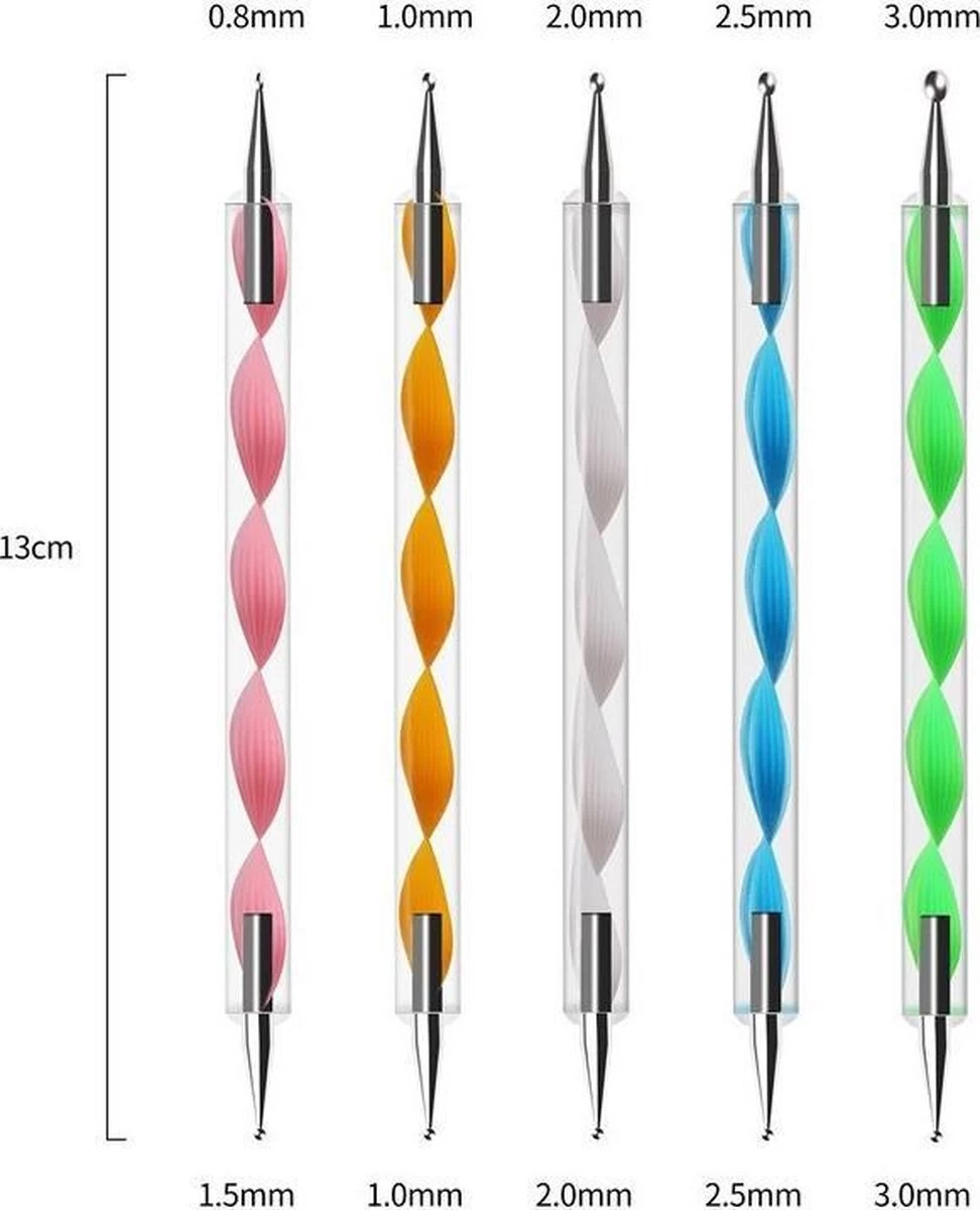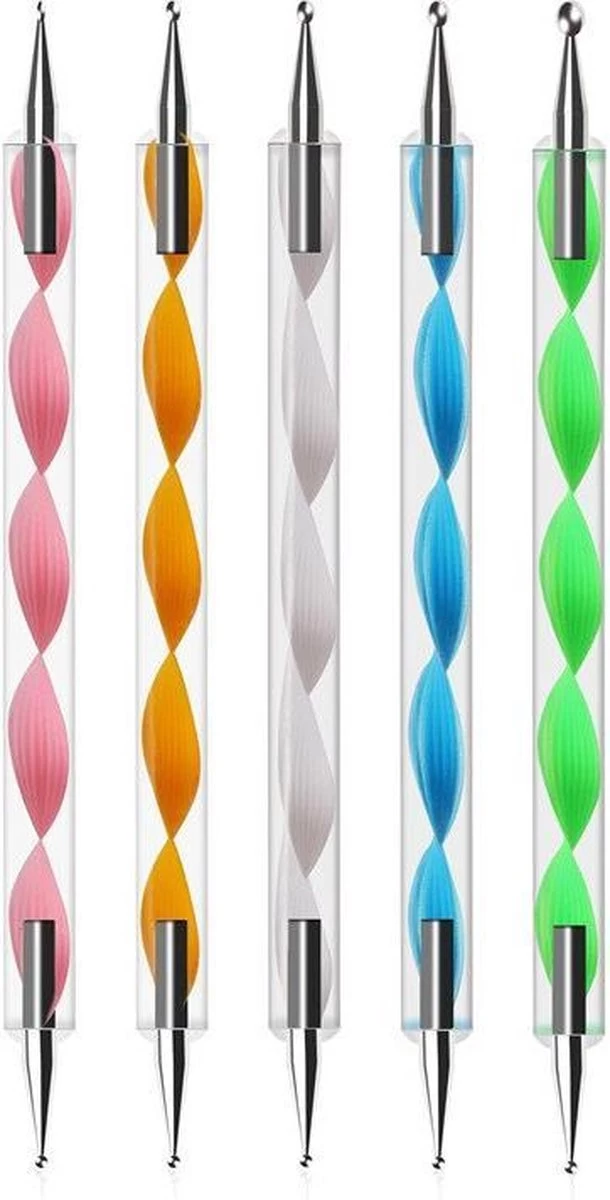 Met deze Evvie© set van 5 dotting tools (10 verschillende ‘dots’) teken je in een handomdraai de mooiste patronen op je nagels.