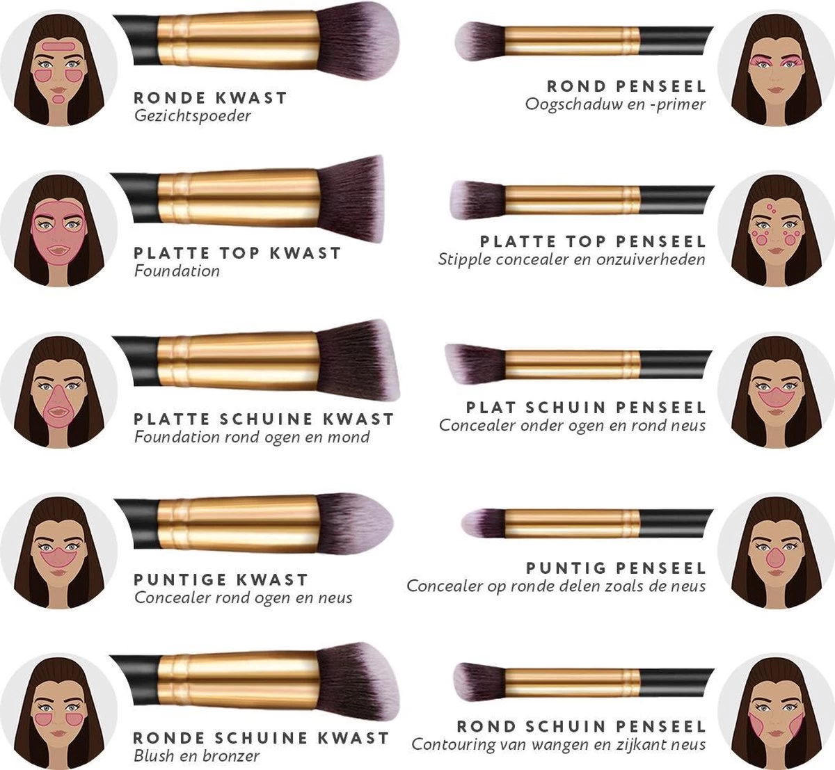 Deze luxe kwastenset bevat 10 professionele make-up kwasten geleverd in een stijlvol etui. De set bevat 5 grote kwasten die je kunt gebruiken voor het aanbrengen en blenden van vloeibare foundation, poeder, bronzer, highlighter, blush, crème en primer en 5 kleine kwasten die geschikt zijn voor het aanbrengen en blenden van oogschaduw, highlighter en concealer.