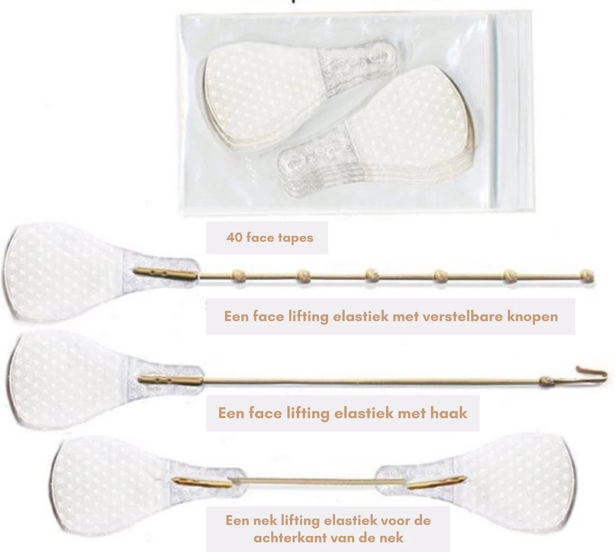 Door middel van zelfhechtende tapes en een elastisch verstelbaar systeem kan er spanning op de huid geplaatst worden, waardoor de gewenste lift verkregen wordt.