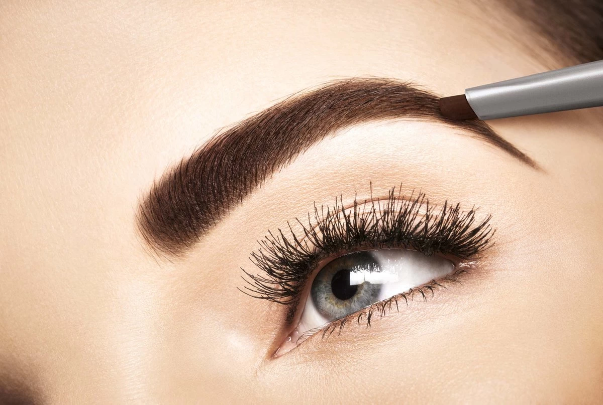 - Vul kale plekjes in de wenkbrauwen op en stijl de wimpers met het borsteltje