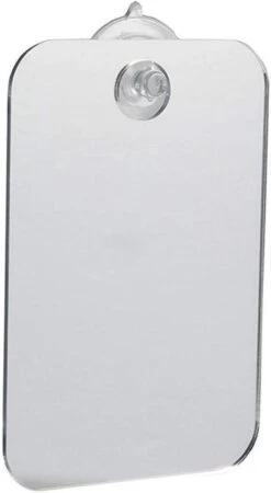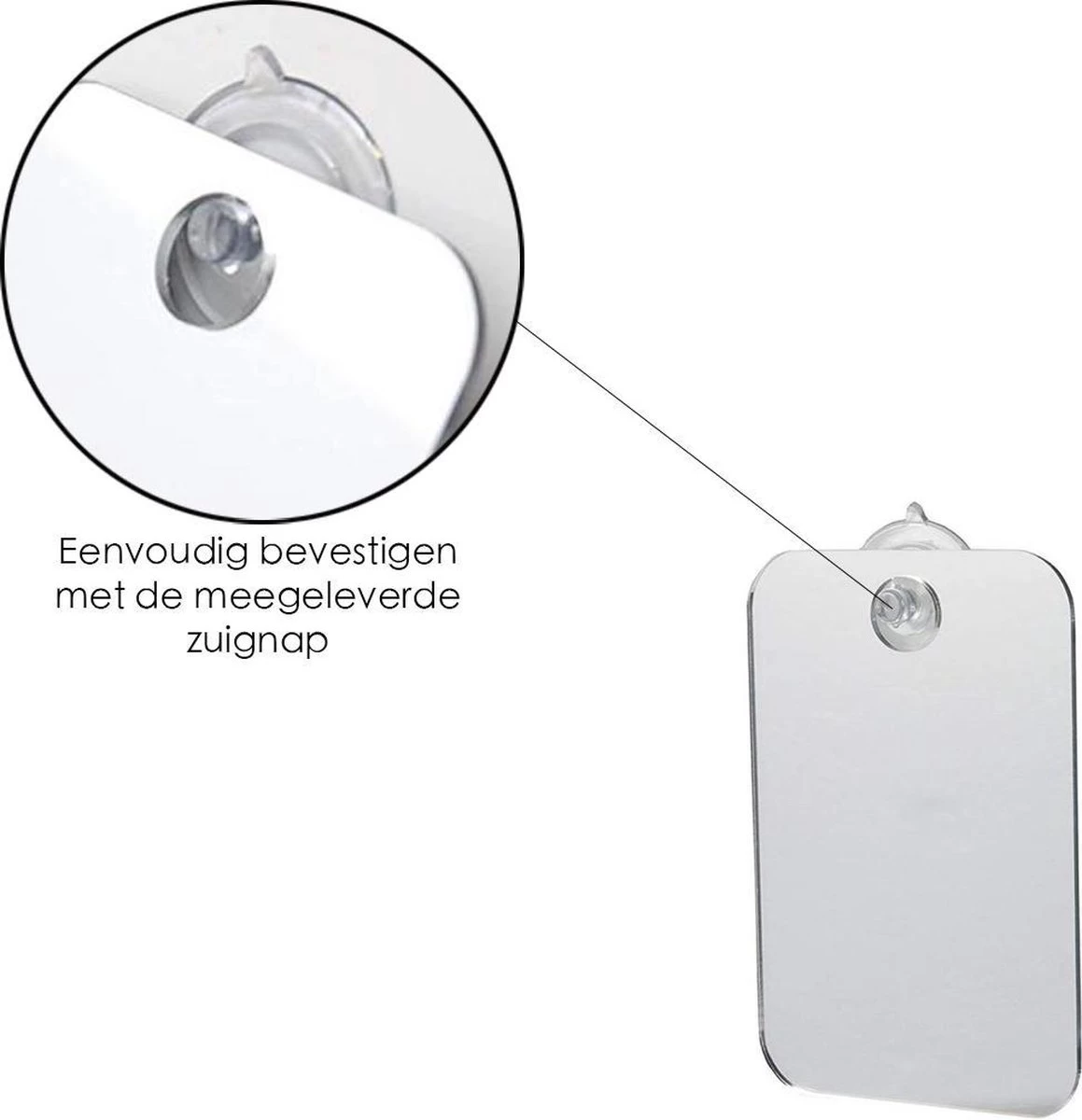 De spiegel is rechthoekig met een rond gat aan de bovenkant in een witte kleur. Door middel van het ronde gat is de spiegel op te hangen aan de zuignap. Ook beschikt de spiegel over ronde hoeken ter bescherming van het spiegelglas, om zo te voorkomen dat de spiegel breekt wanneer je hem meeneemt. Ter bescherming zit er een folie over de spiegel. We raden aan om deze te verwijderen voor het eerste gebruik.