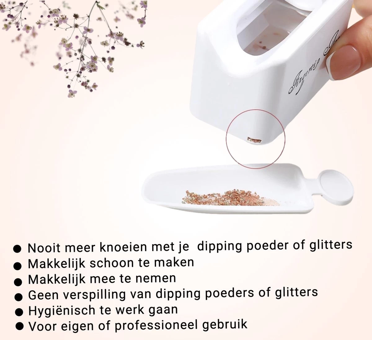 Leg je vinger op het bakje in de speciaal ontworpen uitsnede en strooi de poeder over je nagel. De ongebruikte poeder word opgevangen onder in het bakje en de overgebleven poeder, deze kun je uit de accessoire halen en kun je doormiddel van de mini trechter teug doen in het originele bakje en zo kun je de poeder hergebruiken voor de volgende keer.