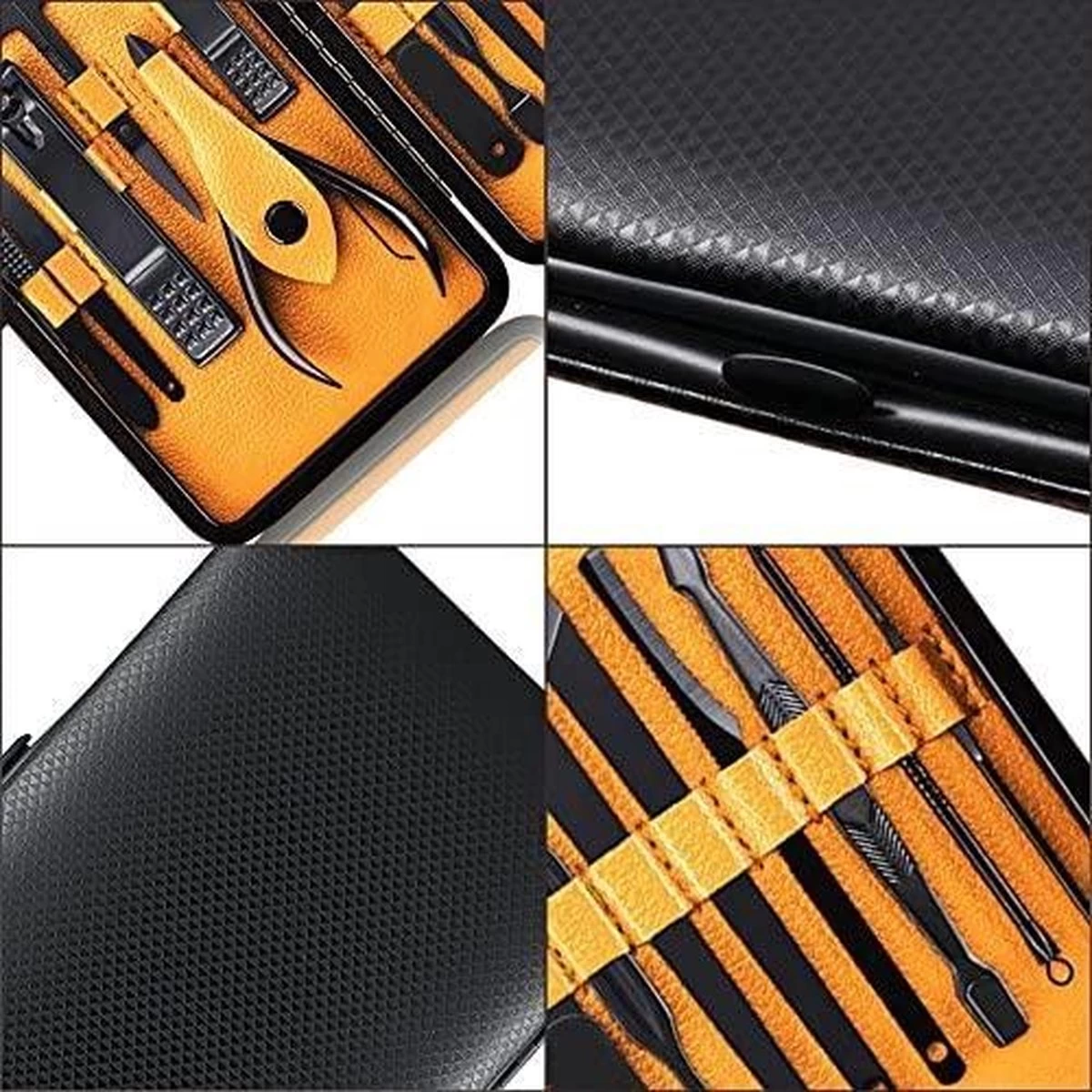 GEHEEL NIEUWE LOOK: Einde van traditionele stijl van manicureset, upgraden van binnen naar buiten, de buitenkant die is gemaakt van zwart ruitvormig PU-leer ziet er heel speciaal uit en zit vol mysterie, de lederen voering met lichee-patroon heeft een sterke textuur, interne steken zijn erg netjes en artistiek, alle gereedschappen maken gebruik van een coole zwarte hot-dip technologie, niet alleen voortreffelijk en luxueus, maar uniek qua uiterlijk, je zult bewonderend strelen als je het ziet