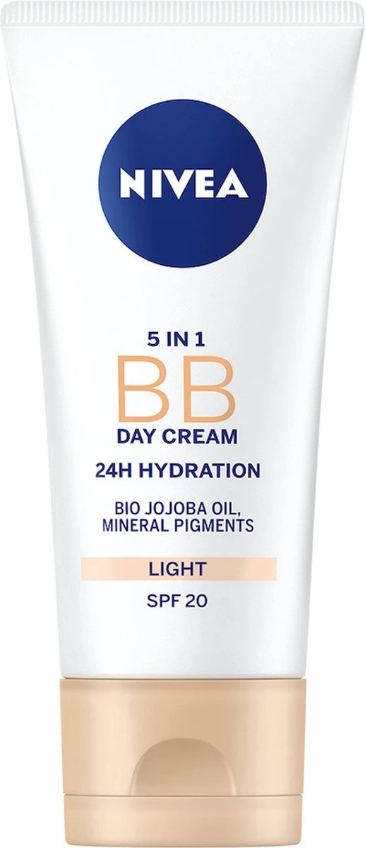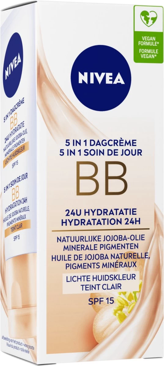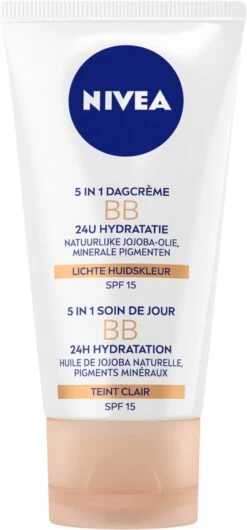 NIVEA 5in1 BB Dagcrème Light SPF15 50ml verrijkt met natuurlijke Jojoba-olie en Minerale pigmenten hydrateert de huid intensief tot 24 uur. De getinte dagcrème voor lichte huidskleur camoufleert imperfecties zoals pigmentvlekjes, tekenen van vermoeidheid, donkere kringen rond de ogen, roodheid en fijne lijntjes. De BB Dagcrème laat de huid stralen en onderstreept de natuurlijke huidteint. De SPF15 biedt bescherming tegen door zonlicht veroorzaakte invloeden.
