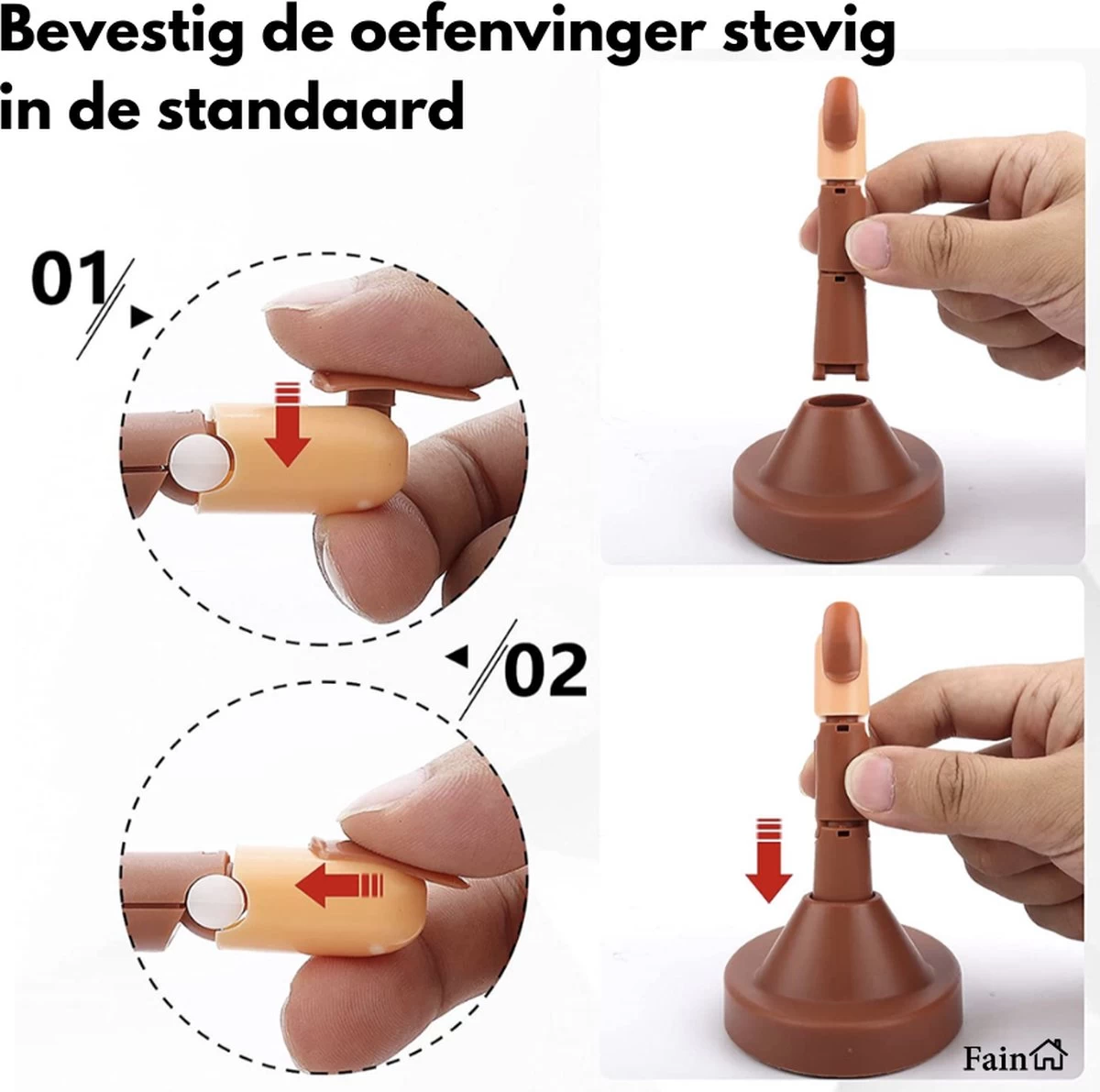 ▶ Geleverd met: 3 oefenvingers, een standaard en 80 nepnagels (!)