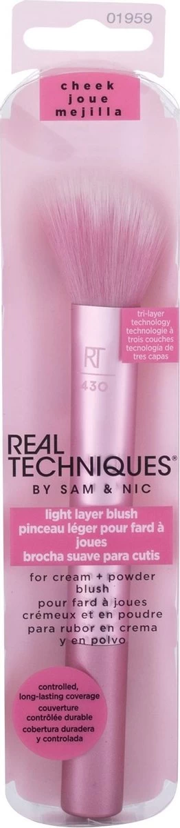 Met de Real Techniques Light Layer Blush met superfluffy en superzacht synthetisch haar breng je jouw favoriete blush zonder al teveel moeite flawless aan én met een mooie airbrushed finish. Dankzij de schuin afgesneden vorm en de zogenaamde tri-layer technologie kun je creamy of poeder blush (en bronzer) mooi lichtjes aanbrengen zonder dat het cakey of too much is. Met de snoeproze kleur mag deze kwast ook zeker gezien worden in je make-up stash!