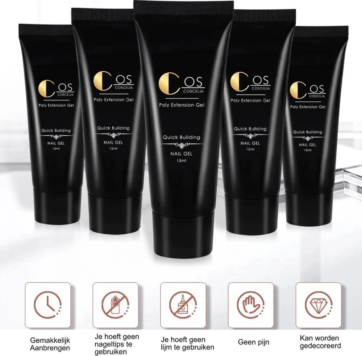 - 6 x Kleuren Quick Building Poly Gel a 15ML (voor kleuren zie hoofdfoto, kleurnummers: 01-02-03-05-07-09)