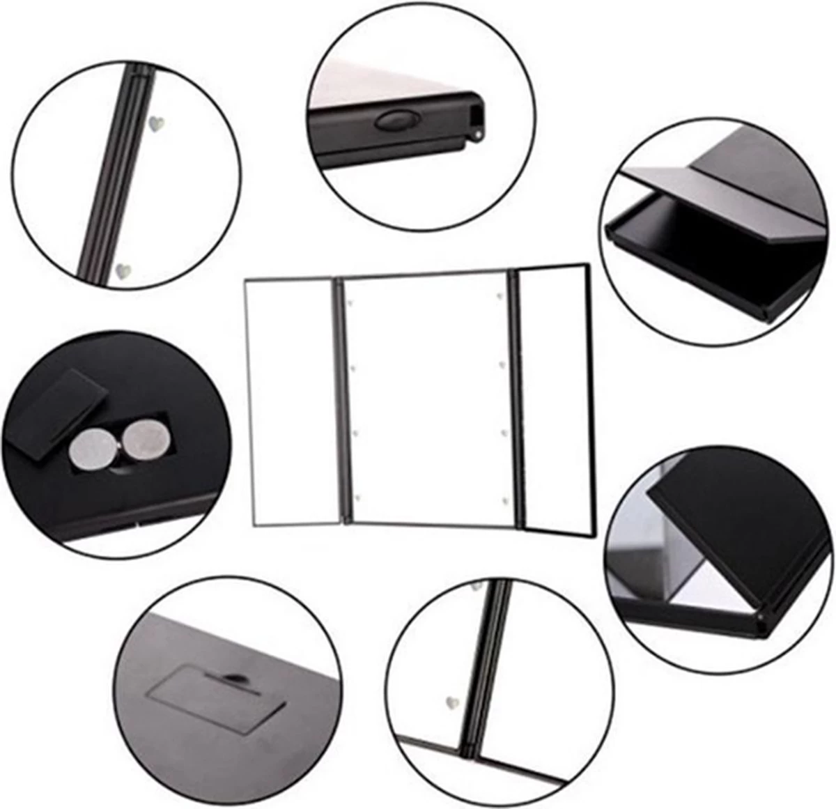 De 3 secties van de Drieluik LED make-up spiegel 2+3 maal vergroting.