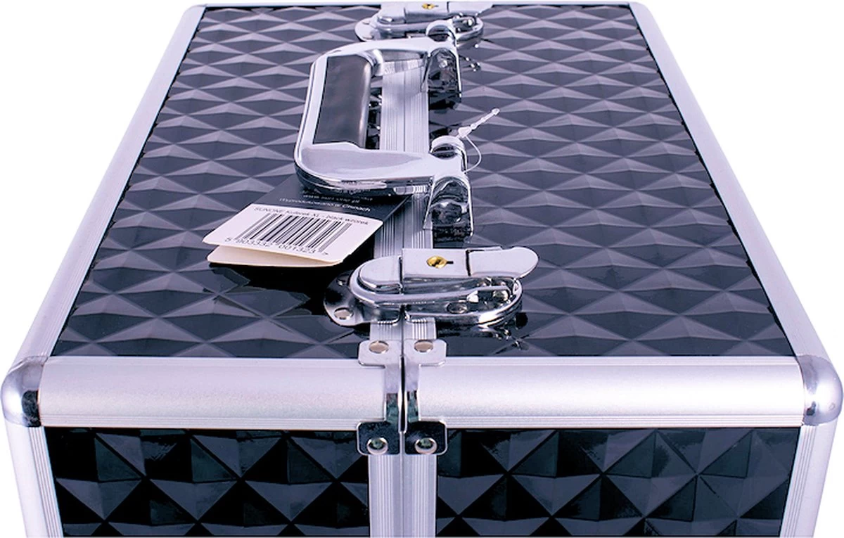 In de stevige, opvouwbare en optimaal bemeten make up koffer XL Zwart kun je eenvoudig een full-size UV- en LED-lamp plaatsen. De make-up koffer XL Zwart gaat aan beide zijden open en heeft 2 verschuifbare planken voor kleine gebruiksvoorwerpen, zoals hybride nagellakken, penselen, kleine en grote cosmetica. Door het lage gewicht perfect voor veldwerk. Het is een stijlvolle make up koffer voor het presenteren van producten tijdens officiële bijeenkomsten, bijvoorbeeld zakelijke bijeenkomsten.